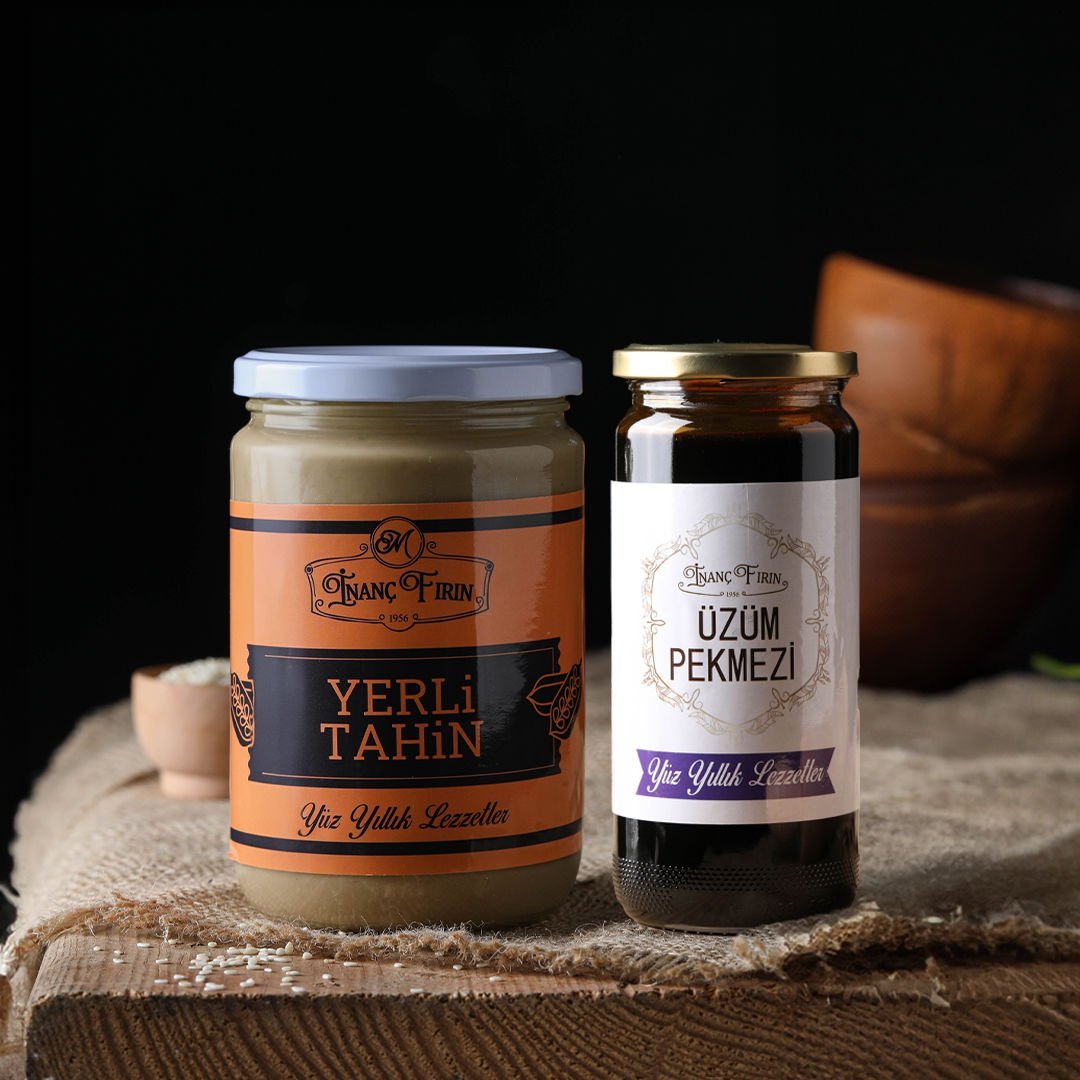 Kahvaltı sofralarının vazgeçilmez ikilisi şimdi özel paket halinde! Taş değirmenlerde üretilen yerli tahin ve doğal yöntemlerle hazırlanan kara üzüm pekmezi, bir araya gelerek eşsiz bir lezzet sunar.