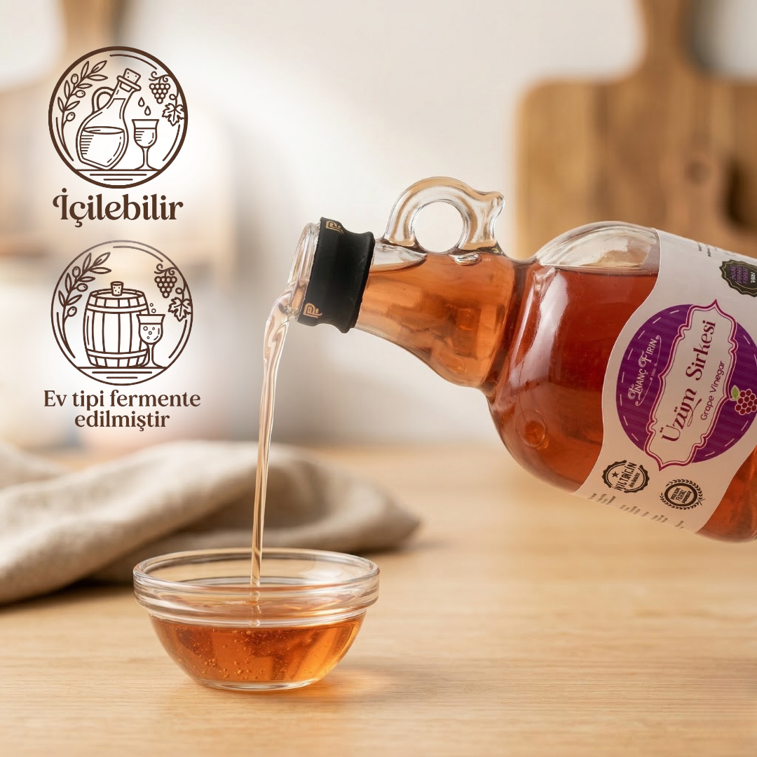 Aylarca süren sabırlı bir mayalanma sürecinden geçen üzüm sirkemiz; pastörize edilmeyen ve filtrelenmeyen (çiğ) formda üretilir. Bu sayede üzümün doğasındaki faydalı enzimler, antioksidanlar ve probiyotik bakteriler canlılığını korur. Market sirkelerindeki o genzi yakan, keskin sentetik asit kokusu yerine; üzümün kendi doğasından gelen yumuşak, hafif meyvemsi ve aromatik bir asiditeye sahiptir. Kışlık turşularınıza efsanevi bir çıtırlık, salatalarınıza ise eşsiz bir lezzet katacak bu %100 saf sirke, kargoda hasar görmesini engelleyen özel ambalajıyla mutfağınıza güvenle ulaşır.