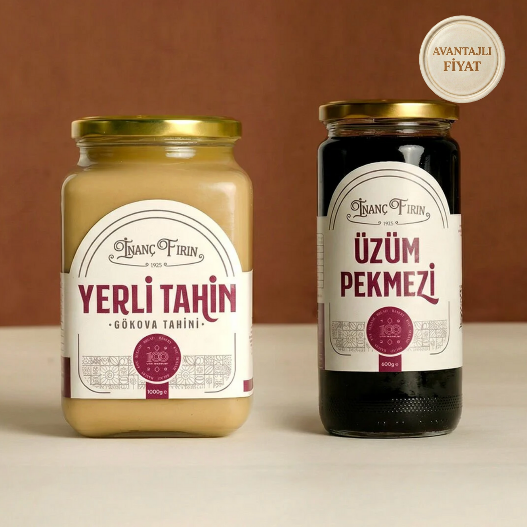 Bu ürün, 1 kg tahin ve 600 gr üzüm pekmezinden oluşan ikili bir settir. Birlikte tüketimiyle bilinen bu iki geleneksel lezzet, pratik bir paket yapısı içinde sunulur. Günlük kullanım ve kahvaltı sofraları için uygun bir kombinasyon oluşturur.