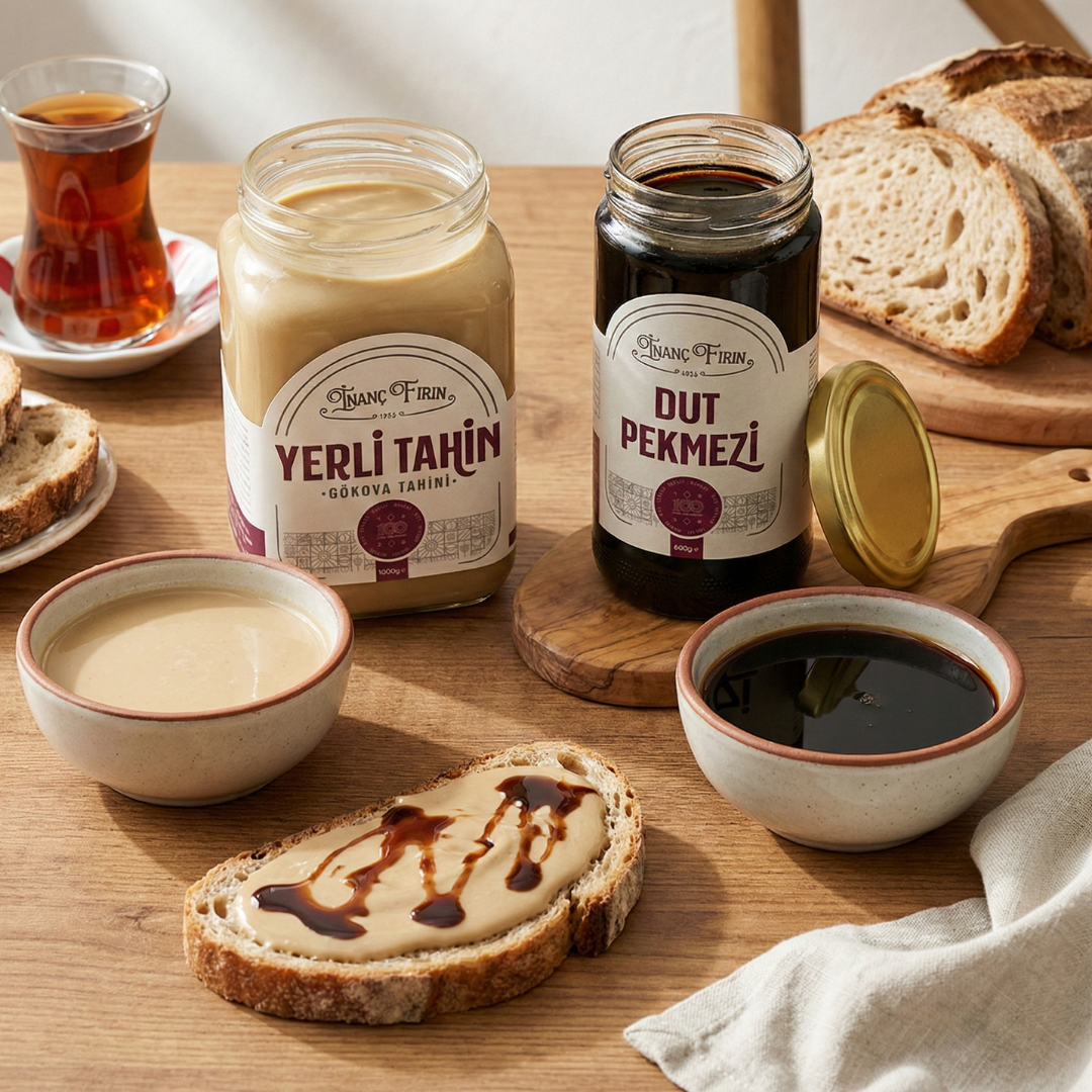 Tahin, yoğun kıvamı ve belirgin susam aromasıyla öne çıkar. Dut pekmezi ise kendine özgü meyvemsi tadı ve akışkan yapısıyla tahini tamamlar. Birlikte tüketildiğinde dengeli ve tanıdık bir lezzet profili oluşturur.
