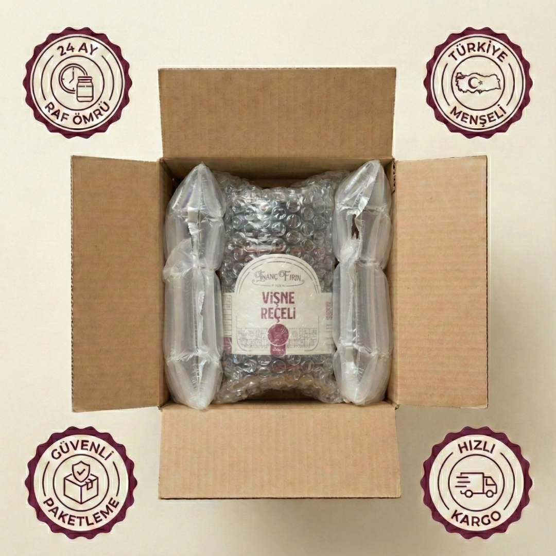 Fabrikasyon işlemlerden uzak durarak, büyük kazanlarda pancar şekeriyle ağır ağır kaynatılan vişnelerimiz; ezilip püre haline gelmeden, tam kıvamında ve bol taneli bir şekilde kavanozlanır. Asla glikoz şurubu, aroma verici, renk sabitleyici veya suni jelleştirici (pektin) içermez. Kaymak, tereyağı veya taze lor peyniri eşliğinde kızarmış ekmeğinizin üzerinde bir lezzet şölenine dönüşecek bu katkısız reçel; taşıma güvenliği için özel darbe emici kutularda adresinize teslim edilir.